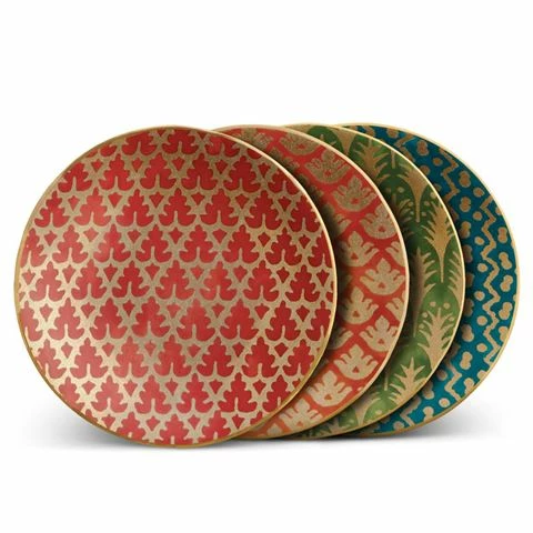 The Fortuny Assorted Canape Plates Set 4pce by L’Objet is composed of earthenware with hand-gilded 24K gold accents. With each plate featuring a different colour and design, this set is sure to bring an element of surprise, sophistication, and luxury to your table.Â
