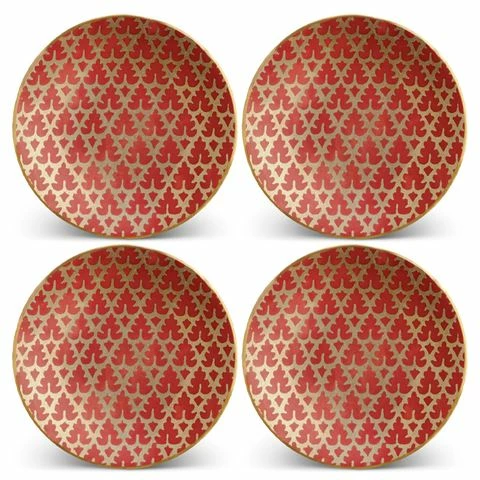 The Fortuny Murillo Canape Plates Red Set 4pce by L’Objet is composed of earthenware with hand-gilded 24K gold accents. Featuring a beautiful design, this set is sure to bring an element of surprise, sophistication, and luxury to your table.