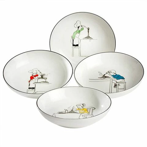 Excuse me but there’s a chef in my soup. Well, not really but when you reach the bottom of this Pasta Bowl Set, you’ll discover an illustration of two nutty chefs and two crazy diners going about their business.